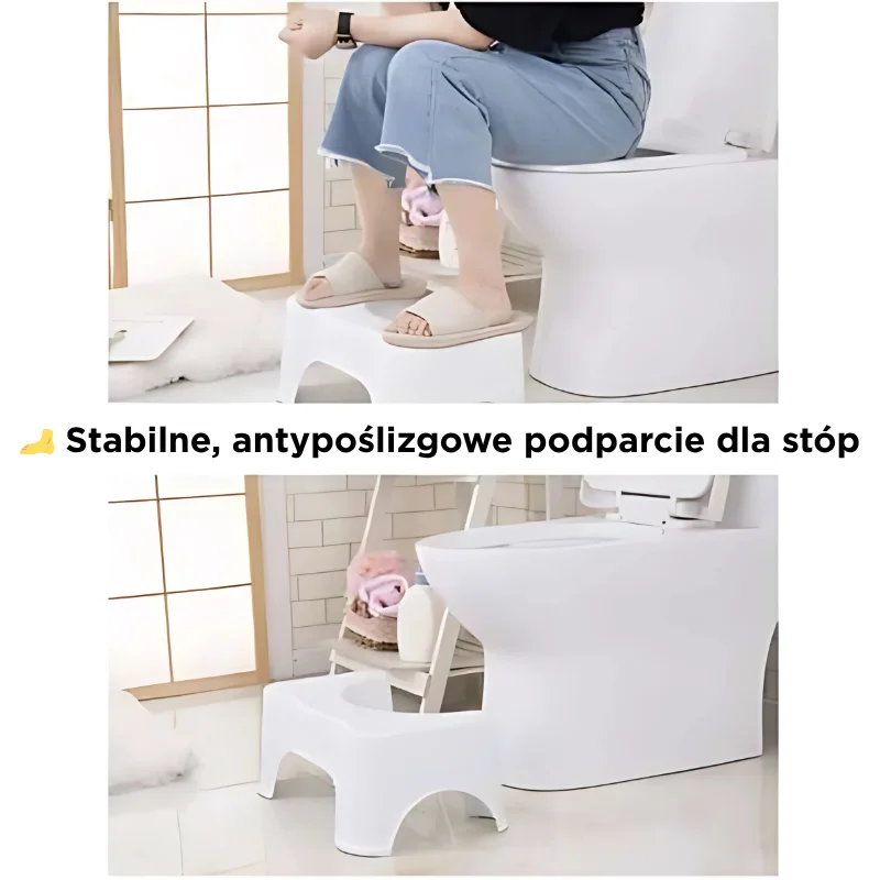 - Korzystanie z podnóżka znacząco zmniejsza parcie, co przynosi ulgę osobom z zaparciami, hemoroidami i innymi problemami jelitowymi – bez konieczności sięgania po leki.
